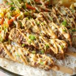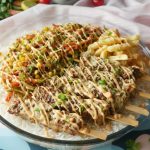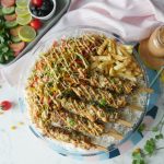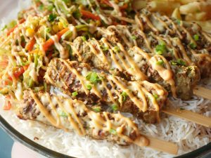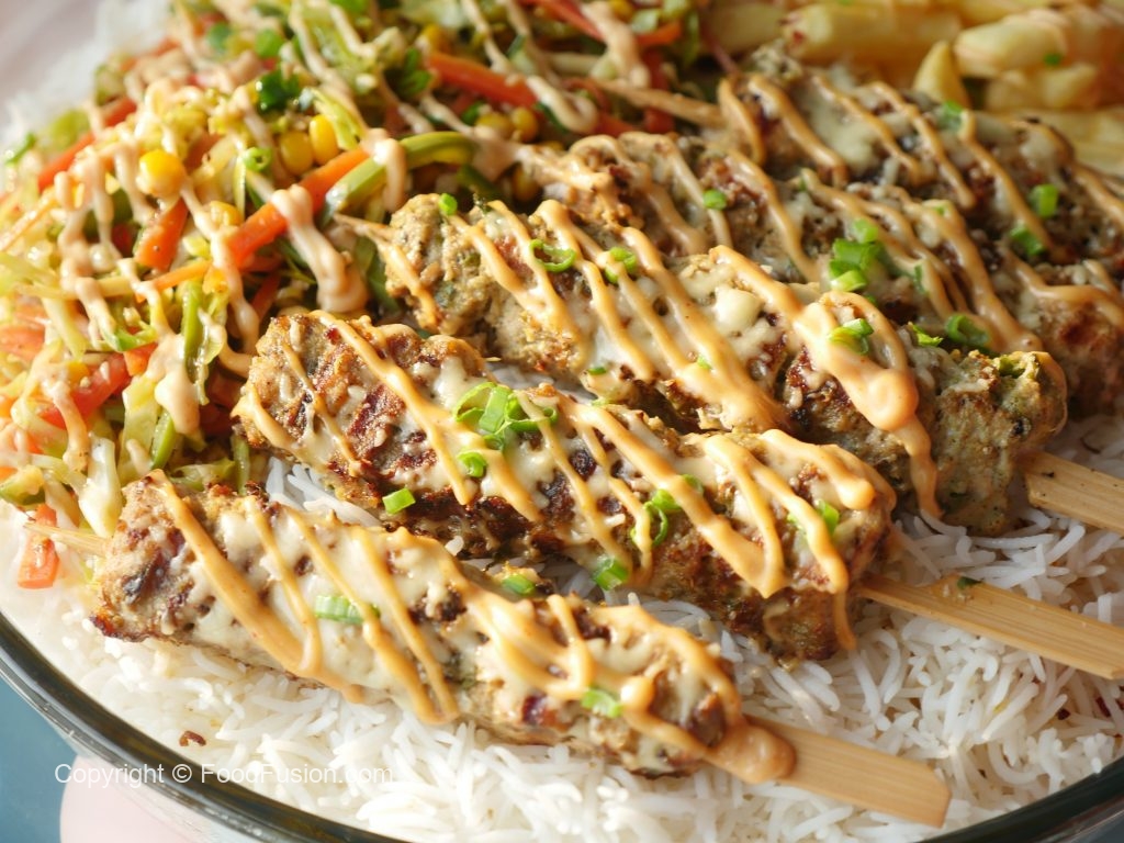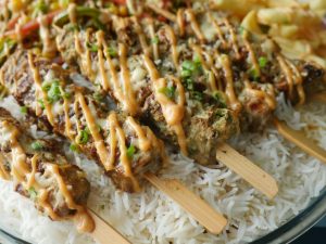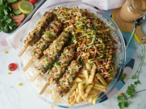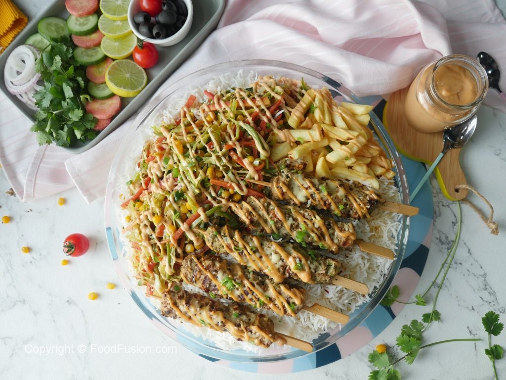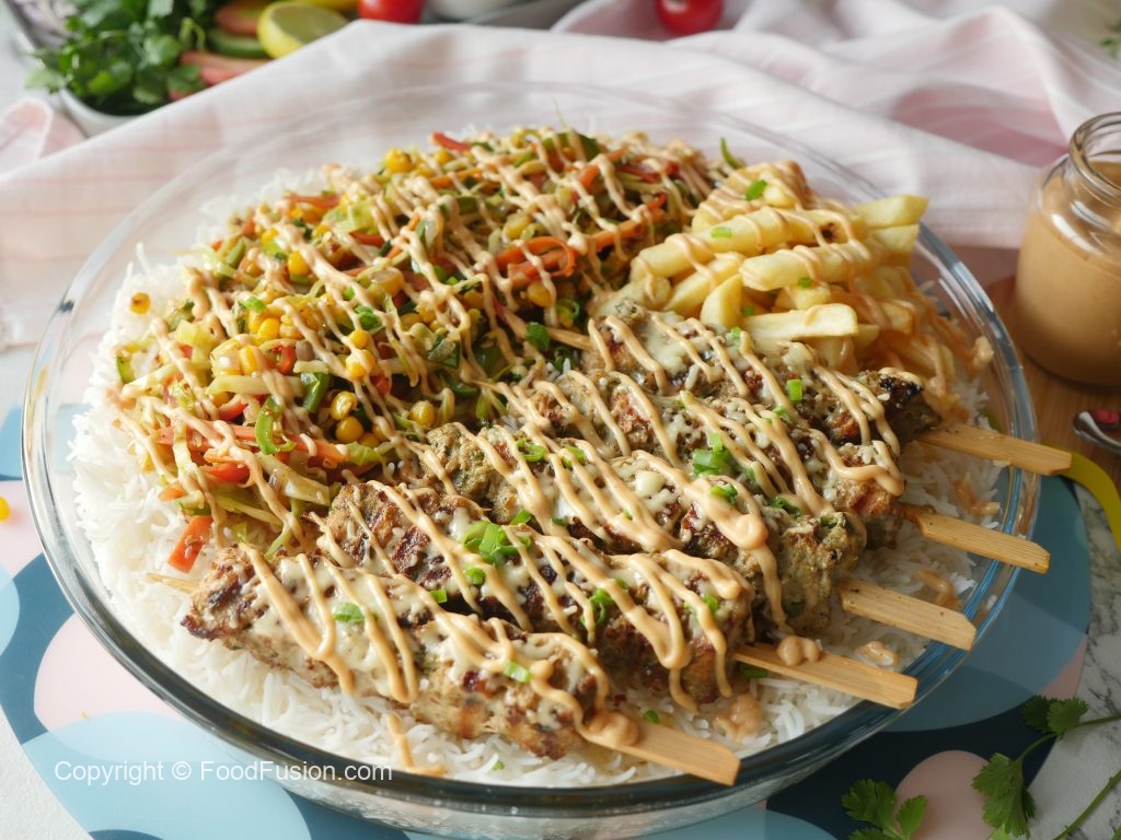 In a serving dish,add boiled rice,add & spread prepared tarka,add prepared vegetables,chicken skewers and potato fries.