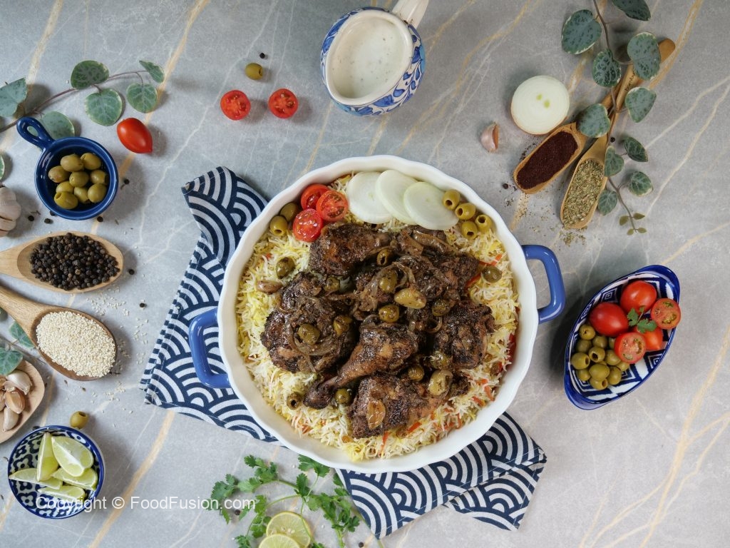 -Marinated chicken aur green olives dal ker dhak dein aur halki ancch per gul janay tak paka lein (30-35 minutes) aur bech bech mein sides ko change ker lein & side per rakh dein.